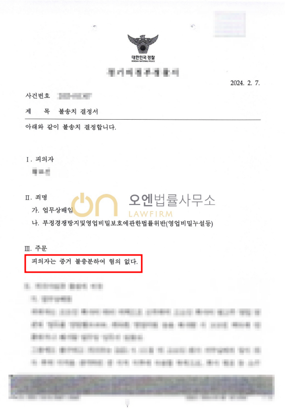 수사기관은 변호인의 주장을 받아들여 부정경쟁방지및영업비밀보호에관한법률위반등에 대해 불송치(증거불충분하여 혐의 없음)결정을 내렸습니다.