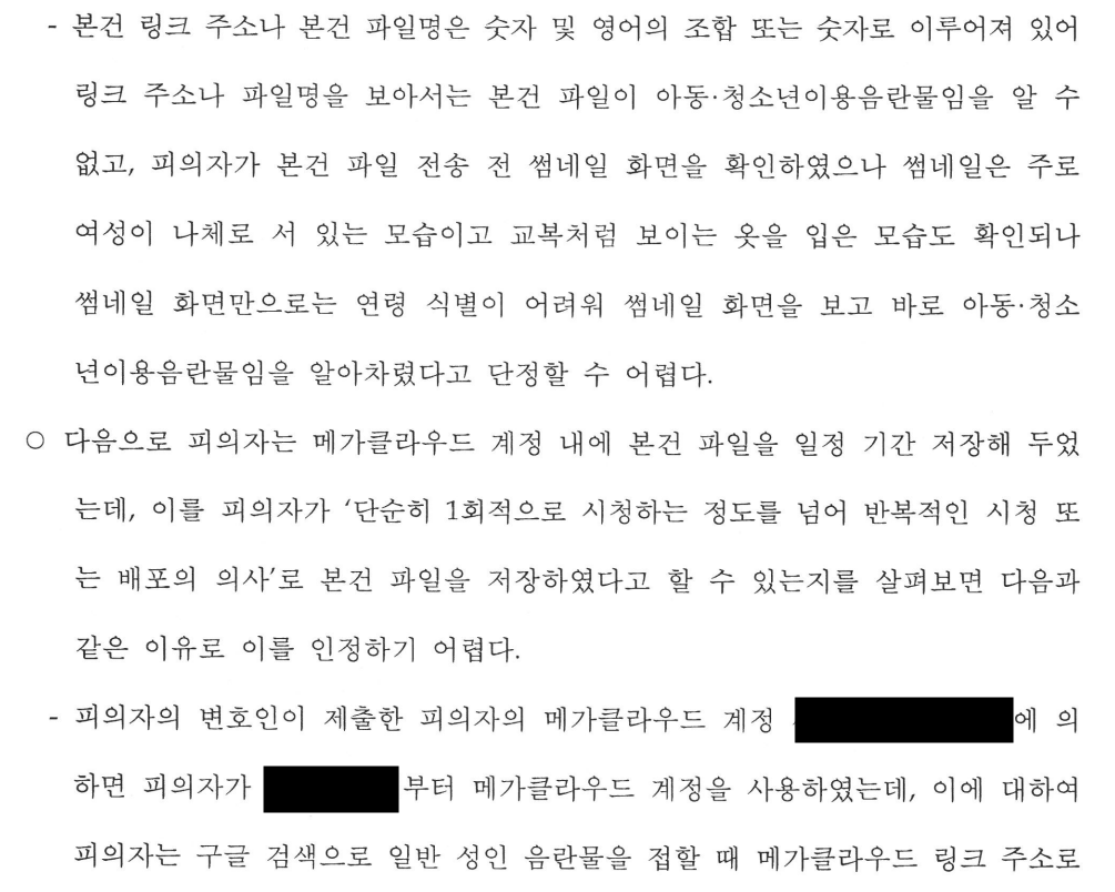 저는 '피의자가 야동을 보기 위해 접속한 사이트에서 우연히 갓갓이 올린 링크를 발견한 것일 뿐 처음부터 아동청소년 성착취물을 검색한 것이 아니었다는 점, 갓갓이 메가클라우드 계정에 올린 동영상 제목은 카카오톡이나 라인에서 파일 다운로드시 부여되는 파일명이었던 탓에 동영상 제목만으로 해당 동영상이 아동청소년 성착취물이라는 사실을 전혀 예상할 수 없을 뿐만 아니라 다운로드 후 섬네일 등을 확인하기 전까지 해당 동영상 내용을 전혀 알 수 없는 점, 더욱이 해당 동영상은 피해 여성의 모습만 등장하는 매우 짧은 길이의 동영상으로, 처음부터 성착취물인지 알고 다운로드하였는다는 등의 특별한 사정이 없는 한 해당 동영상을 다운로드하여 시청하였더라도 해당 동영상이 아동청소년 성착취물인지 알 수 없는 점, 피의자는 단순히 해당 동영상이 남녀성관계 장면이 담긴 소위 야동인 줄 알고 다운로드한 것일 뿐 해당 동영상을 거듭 시청하거나 다른 기기로 옮기는 등 적극적으로 해당 동영상을 보관하거나 유통한 사정이 없는 점, 피의자는 해당 동영상의 존재를 인지하지도 못하고 있다가 무료 계정에서 이용할 수 있는 25GB가 다 차게 되자 과거에 다운받았던 동영상들을 삭제하면서 해당 동영상도 함께 삭제한 것이 전부인 점 등'을 하나하나 언급하며, 피의자에게 아동청소년 성착취물에 소지에 대한 인식이나 의사가 전혀 없었다는 사실을 피력하였습니다.