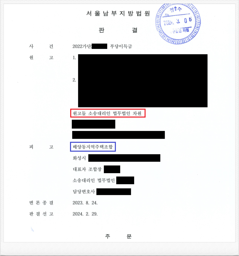그러나, 가입 후 피고 배양동지역주택조합 측이 진행하는 사업이 계획대로 진행되지 않았고, 이에 의뢰인들은 정식 민사소송을 통하여 기 납입한 금원의 반환을 원하였습니다.