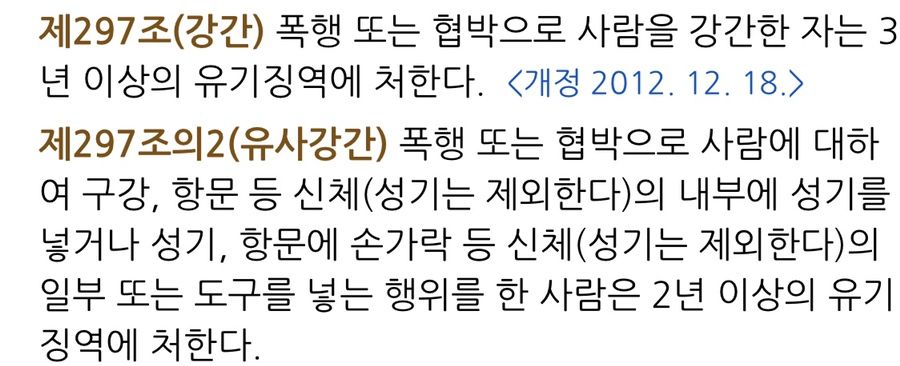 제297조(강간) 폭행 또는 협박으로 사람을 강간한 자는 3년 이상의 유기징역에 처한다.