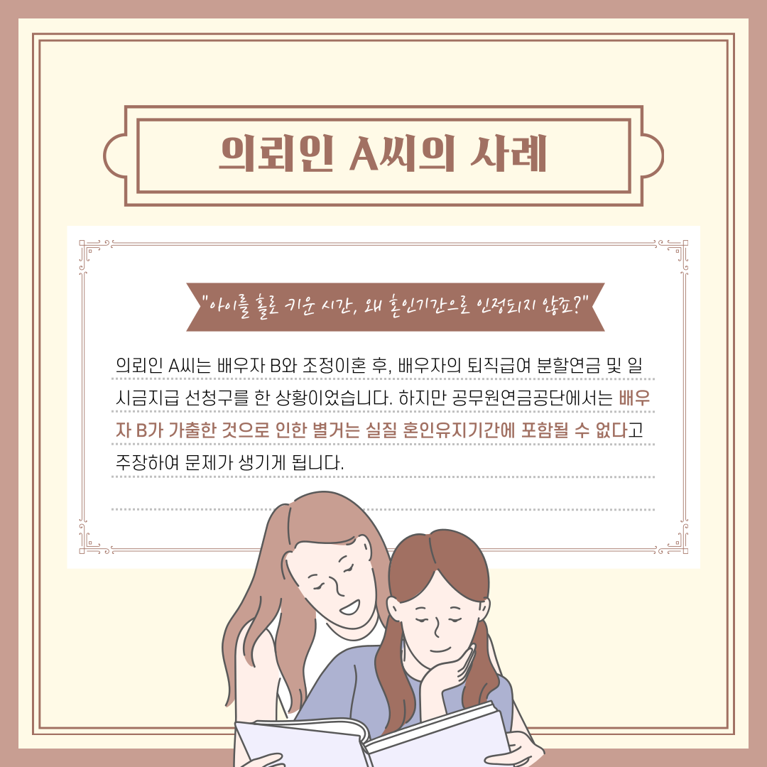 앞서 실질적인 혼인유지기간이 얼마나 인정이 되는지에 따라서 분할연금의 액수가 달라지게 된다고 말씀드렸는데요. 법무법인 새움을 찾아오신 의뢰인도 배우자와의 실질적 혼인유지기간에 대한 의견 차이로 문제가 생겼습니다. 의뢰인은 조정이혼을 한 후 배우자의 퇴직급여의 분할연금 및 일시금지급 선청구를 한 상황이었는데요. 공무원연금공단에서는 배우자가 가출한 것으로 인해 별거를 하게 된 기간은 포함될 수 없다고 주장하여 문제가 생기게 됩니다.