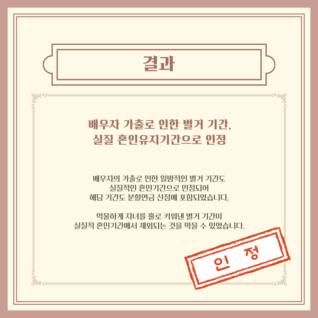 이렇게 종종 청구를 한다고 해도 문제가 생기는 경우가 있습니다. 내가 주장하는 바와 전 배우자나 공단 측에서 바라보는 부분이 다른 경우 법적인 공방이 오고 가기도 합니다. 다행히 해당 사건은 빠르게 대응한 끝에 큰 문제 없이 전부 인용을 받을 수 있었고, 이를 통해 억울하게 자녀를 홀로 키웠던 별거기간이 실질적 혼인기간에서 제외되는 것을 막을 수 있었습니다.