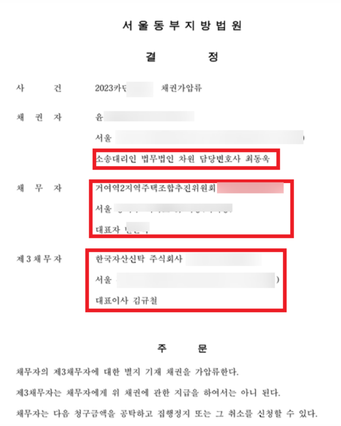 이후 최동욱 변호사는 의뢰인의 피해금액 전액회수를 위하여, 신탁사(한국자산신탁)를 상대로 채권가압류등 강제집행을 신청하여, 서울동부지방법원의 채권가압류 결정을 받아냈습니다.