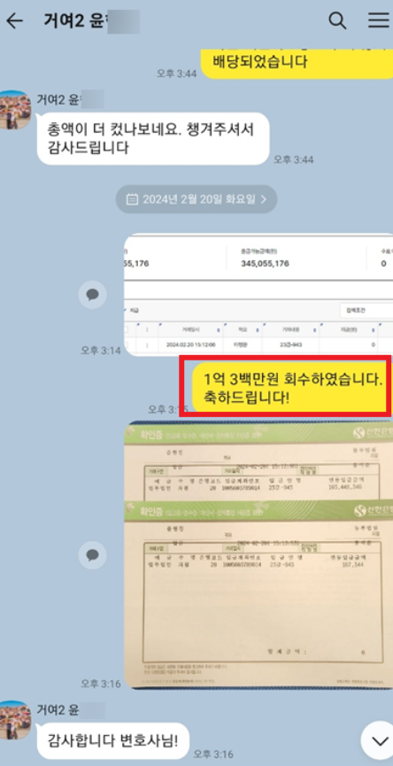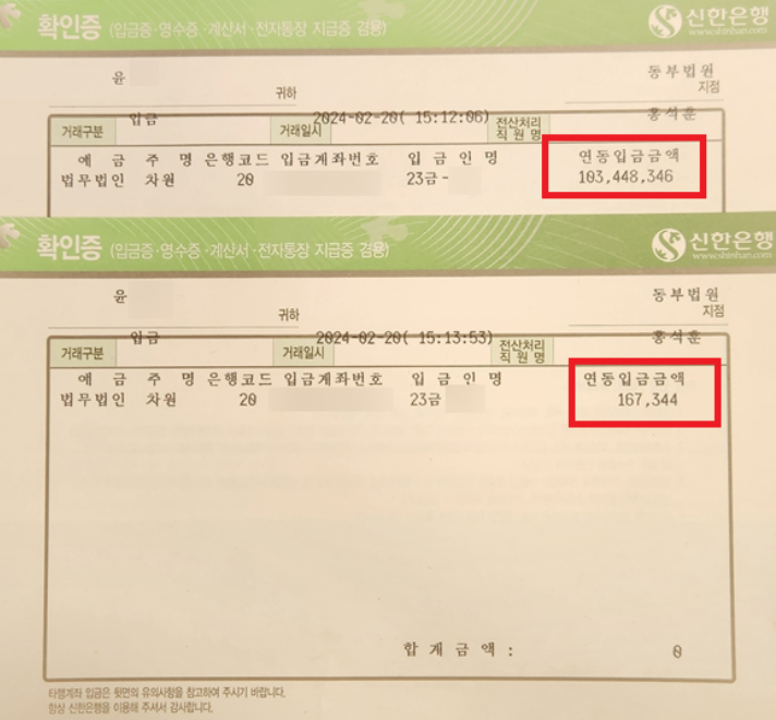 위와 같은 최동욱 변호사의 강제집행 실시에 따라, 결국 신탁사(한국자산신탁)는 의뢰인이 지급받을 금액을 법원에 공탁하였고, 이로써 의뢰인은 2024. 2. 20. 피해금액 중 약 1억 300만원을 실제로 회수하였습니다.