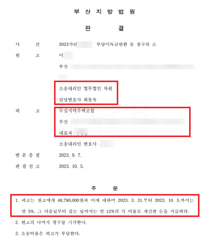 [두실 지역주택조합을 상대로 한 승소판결]