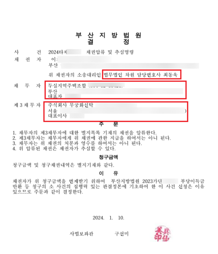 이후 최동욱 변호사는 의뢰인의 피해금액 전액회수를 위하여, 신탁사(무궁화신탁)를 상대로 채권압류추심 등 강제집행을 신청하여 아래와 같이 부산지방법원의 채권압류추심결정을 받아냈습니다.