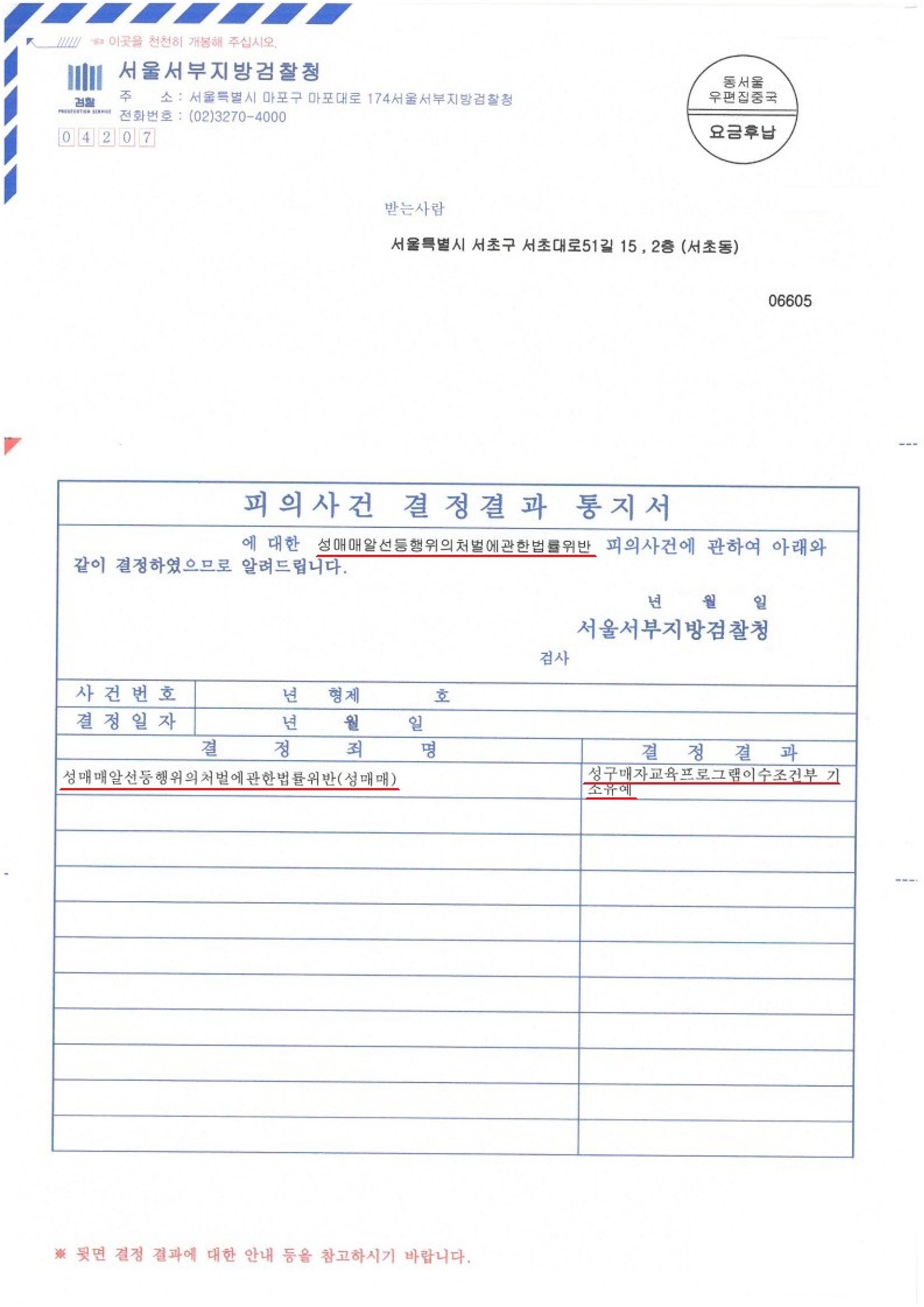 이와 함께 그 동안 많은 성매매 사건을 진행하고 모든 사건을 기소유예처분으로 종결시킨 경험을 토대로 확보한 다양한 양형자료들을 안내해드렸고, 경찰 단계 및 검찰 재판 단계별로 양형자료들을 제출하는 시기를 설정해 드렸습니다.