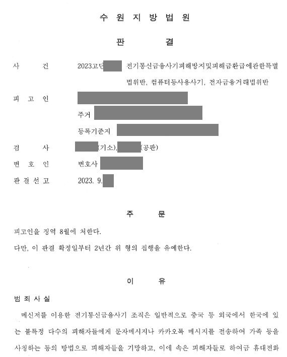 초범이긴 하지만 범죄 혐의가 통신피해사기환급법 위반, 컴퓨터등이용사기, 전자금융거래법 위반(범죄에 이용될 것을 알면서 타인의 현금카드를 보관한 행위) 등 세 가지나 되기 때문에 실형도 걱정되는 상황이었습니다. 다행히도 법원은 의뢰인의 반성하는 태도와 피해 변제 사실을 참작하여 징역 8월에 집행유예 2년을 선고하였습니다. 이로써 의뢰인은 실형을 피하고 구치소에 수감될 위기에서 벗어날 수 있었습니다.