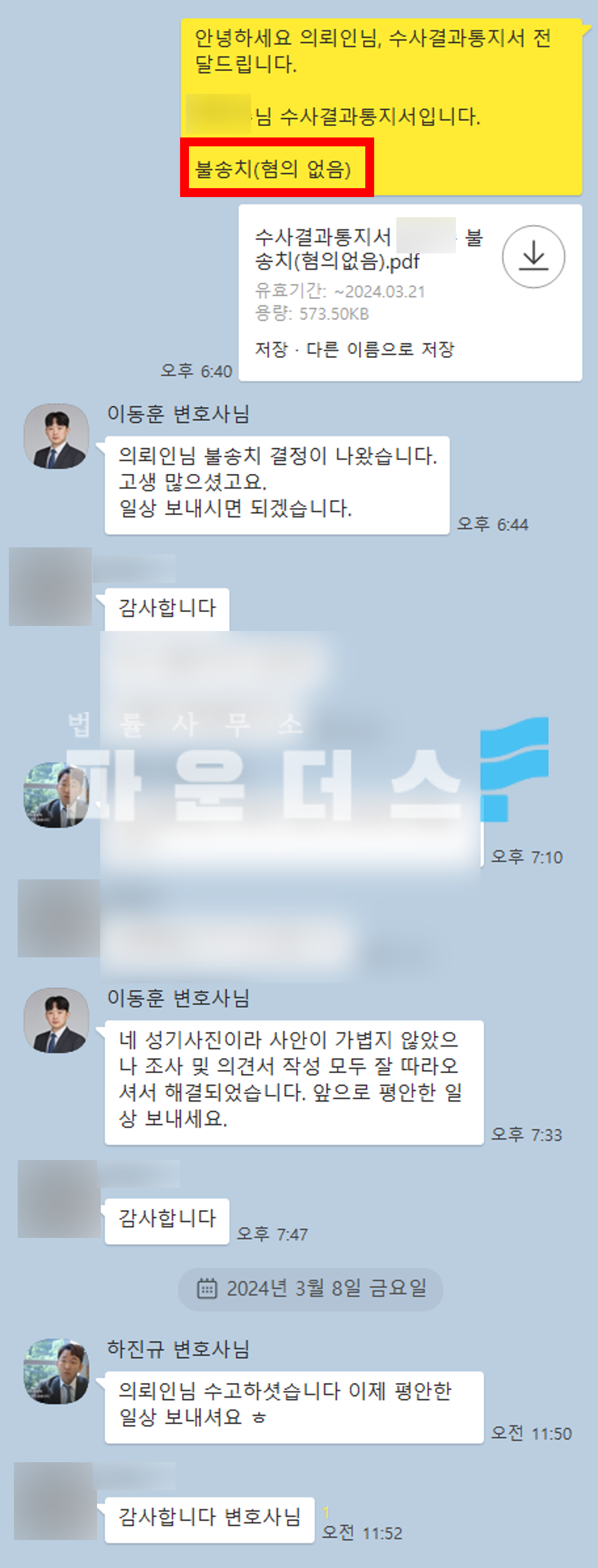 그 결과 랜덤채팅 내에서 통매음 헌터의 유도에 넘어가 성기 사진 전송을 한 통매음 사건에 있어 의뢰인은 불송치 결정을 받게 되어 경찰 단계에서 사건을 마무리 지을 수 있게 되었습니다.