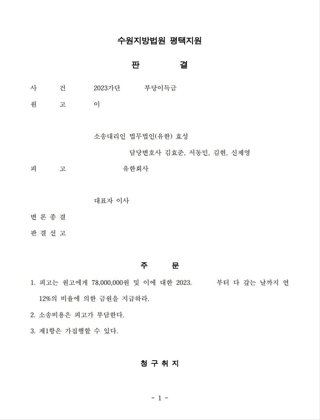 저는 즉각 입금 받은 법인을 피고로 하여 민사소송 부당이득반환청구소송을 제기하였고 법원은 원고 승소 판결을 선고하여 의뢰인은 피해액을 반환받았습니다.