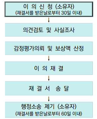 - 유의사항 : 잔여지 가치감소 등으로 인한 손실보상도 재결절차를 거쳐 행정소송을 제기하여야 합니다.