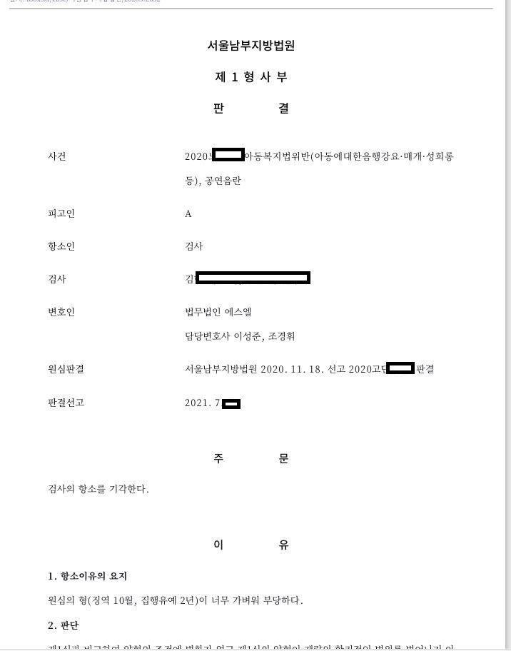 의뢰인은 어린 아동에게 성기를 보여주는 방법으로 공연음란, 아동복지법위반으로 1심에서 집행유예선고를 받았었습니다. 아무래도 피해자와 합의가 되지 않았고 미성년자 대상 범행이어서 검찰에서는 항소를 할 수 밖에는 없는 사건이었는데요. 다행히 양형주장을 잘하여 피해자와 별도의 합의없이 원심이 유지되어 실형선고를 피할 수 있었습니다. 미성년자 대상 범죄는 거의 모든 경우 실형의 위험성이 있으므로 각별히 주의하시고 법률 전문가의 도움을 받으시는 것이 좋습니다.