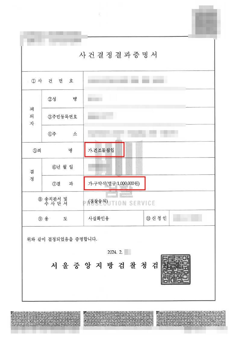 제319조 ①사람의 주거, 관리하는 건조물, 선박이나 항공기 또는 점유하는 방실에 침입하는 자는 3년 이하의 징역 또는 500만원 이하의 벌금에 처한다.