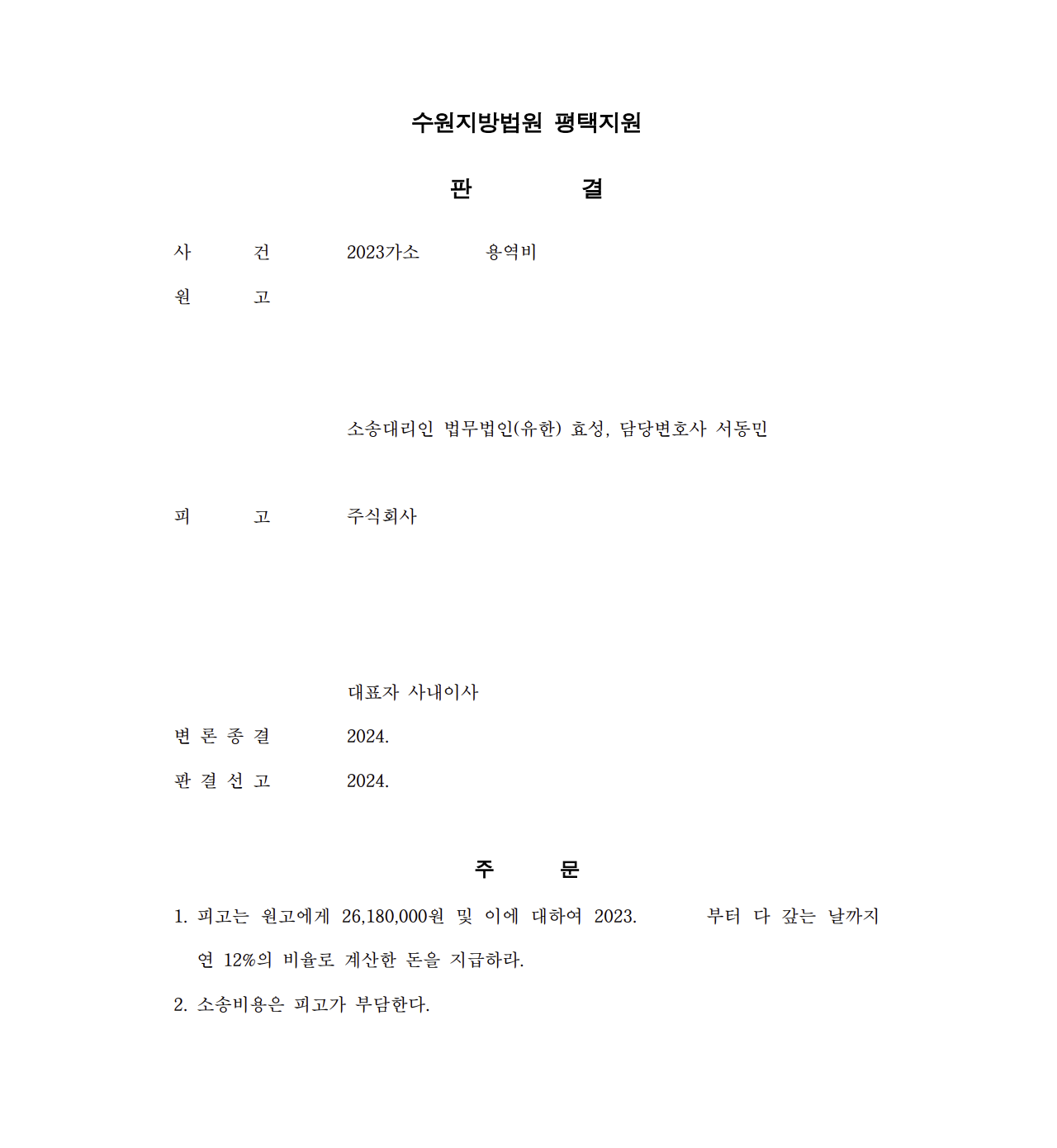 저는 즉각 용역대금지급청구소송을 제기하였고 법원은 원고 승소 판결을 선고하여 의뢰인은 용역대금을 지급받았습니다.