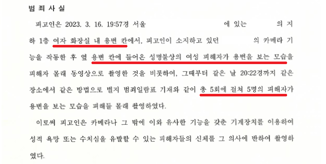 A씨는 2023. 3. 16. 19:57경 건물 지하 여자화장실 용변 칸에서 총 5회에 걸쳐 옆 용변 칸에 들어온 5명의 여성 피해자들이 용변을 보는 모습을 몰래 촬영하다가 적발되어 현장에서 현행범 체포되었습니다.