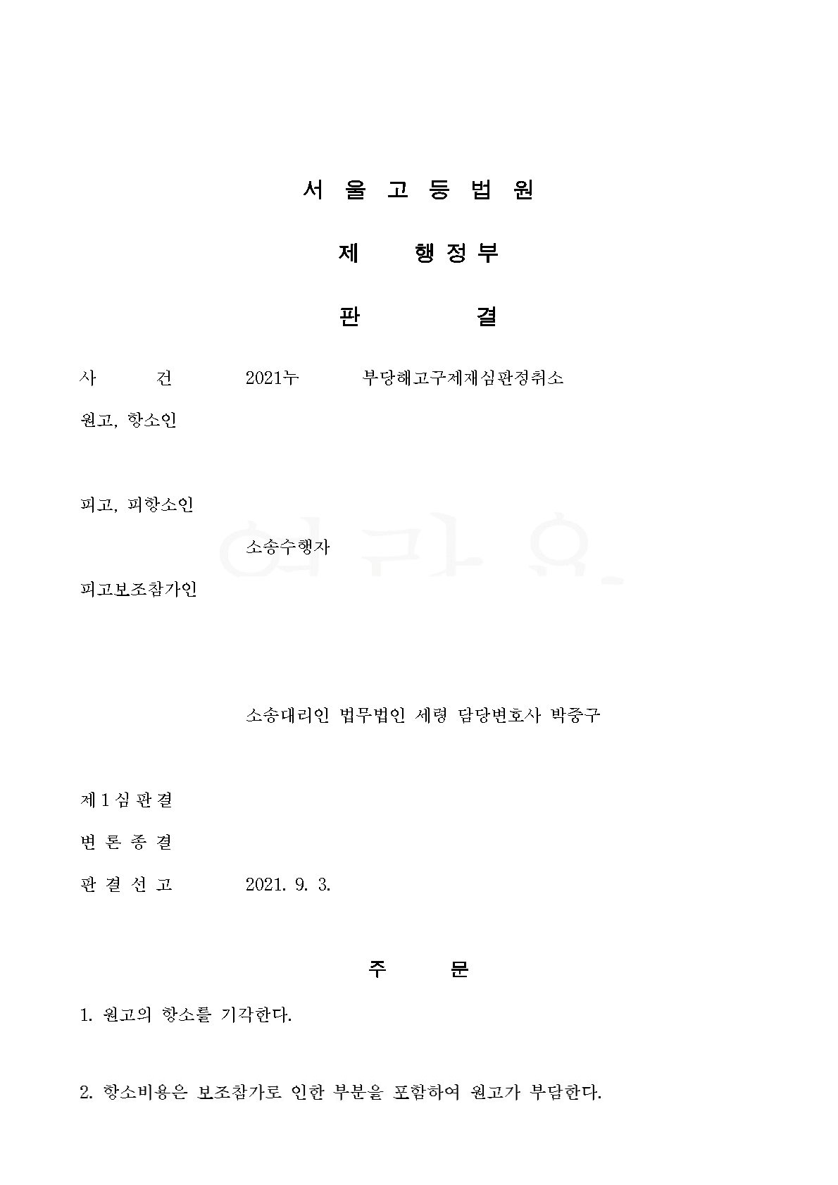 2. 저는 위 소송에 보조참가한 의뢰인을 대리하여 회사의 해고는 이중징계가 아니며 해고가 정당함을 주장입증하여 원고의 청구를 기각한다는 판결을 받을 수 있었고, 항소심에서도 승소하였습니다.