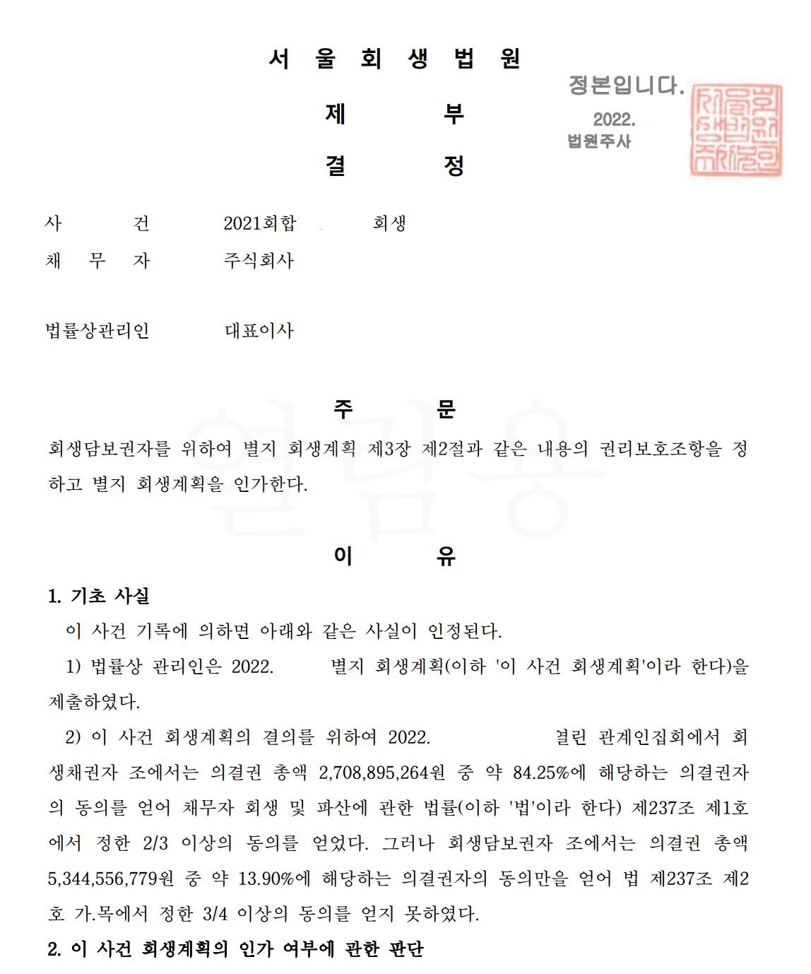 2. 의뢰인의 강력한 회생의지로 회생절차를 진행하였으나, 회생담보권자 조에서는 동의를 얻지 못하여 회생이 좌절될 위기가 있었으나, 회생의 필요성에 대한 소명과 회생채권자조의 동의로 법원의 강제인가 결정을 받을 수 있었던 사례입니다.