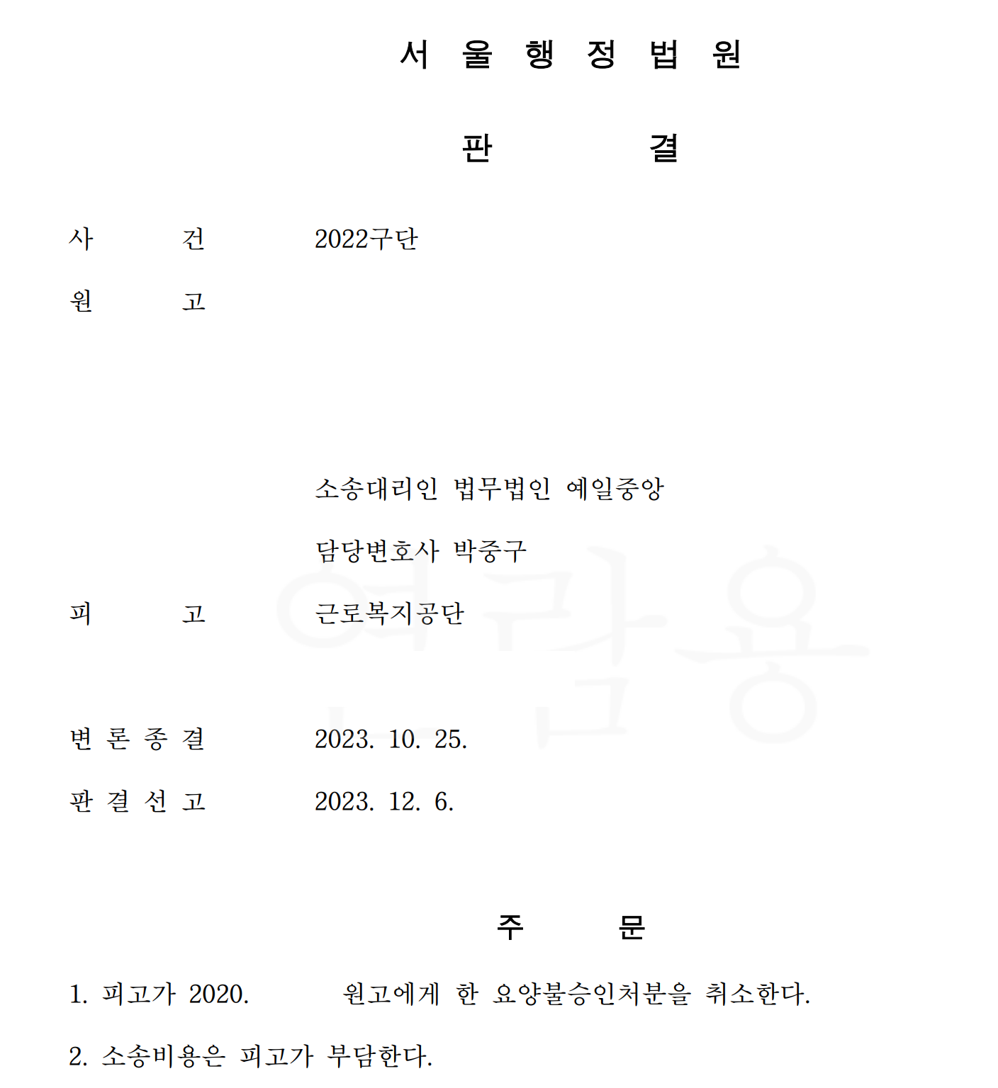 2. 이미 업무상질병판정서나 산재보험심사 및 재심사 결과로 업무관련성을 인정받지 못하여 매우 어려운 건이었으나, 저는 본안에서 전심절차까지 인정된 사실관계와 다른 사실들이 있었음을 주장입증하여 다행히 승소판결을 받은 사례입니다.