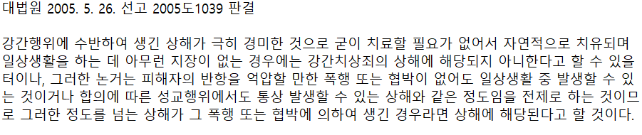 또한 해당 상해가 강간 성립 이후 별도의 폭행에 의하여 생긴 것이라면, 이를 두고 강간상해죄라 할 수는 없기 때문에 당시 상황들을 잘 살펴볼 필요가 있습니다.