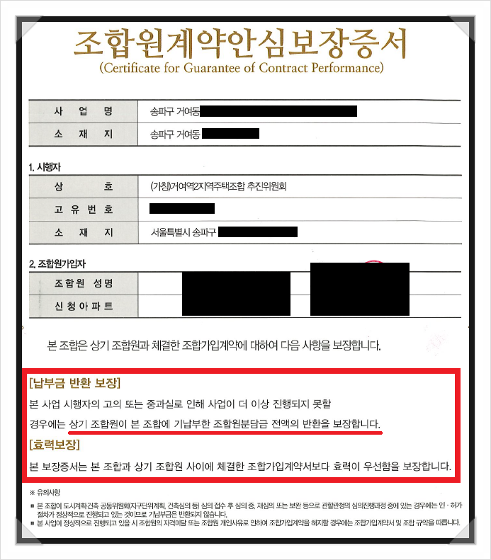 의뢰인 2인(정OO, 이OO)께서는 송파구에 위치한 거여역2지역주택조합과 조합원 가입계약을 체결하여 각각 약 1억 이상의 계약금과 업무추진비, 그리고 분담금을 조합원에 납부하셨습니다. 의뢰인들은 거액의 목돈이 들어가는 투자이기 때문에 계약을 망설였었지만 계약 시 '본 사업 시행자의 고의 또는 중과실로 인해 사업이 더 이상 진행되지 못할 경우에는 상기 조합원이 본 조합에 기납부한 조합원분담금 전액의 반환을 보장합니다'라는 내용의 조합원계약안심 보장증서를 교부받는다는 상담원의 설명에 안심하게 되어 해당 증서를 교부받고 계약금을 납부하게 되었습니다.