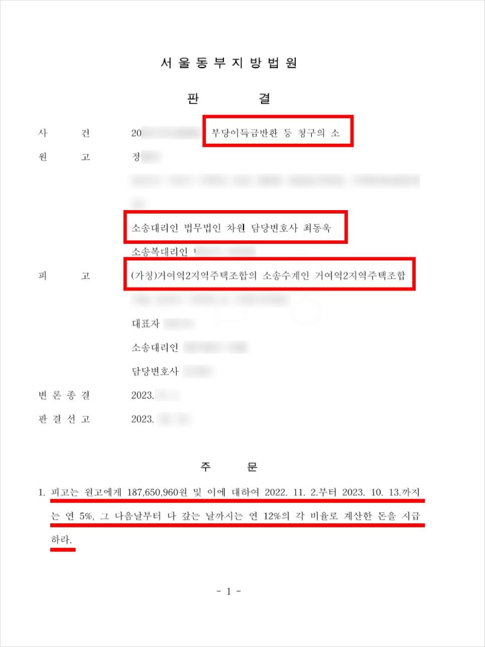 최동욱 변호사는 앞서 진행했던 다수의 거여역2 지역주택조합과의 소송때와 마찬가지로 의뢰인들의 조합가입계약이 조합원계약안심보장증서 교부라는 조합의 기망 행위로 인해 성립된 것이라는 주장을 소명하였고, 판결과 서울동부지방법원은 최동욱 변호사의 주장을 받아들여, 거여역2지역주택조합으로 하여금 의뢰인들이 납부한 조합원분담금 전액 및 그에 대한 지연이자를 반환하라는 승소판결을 선고하였습니다.