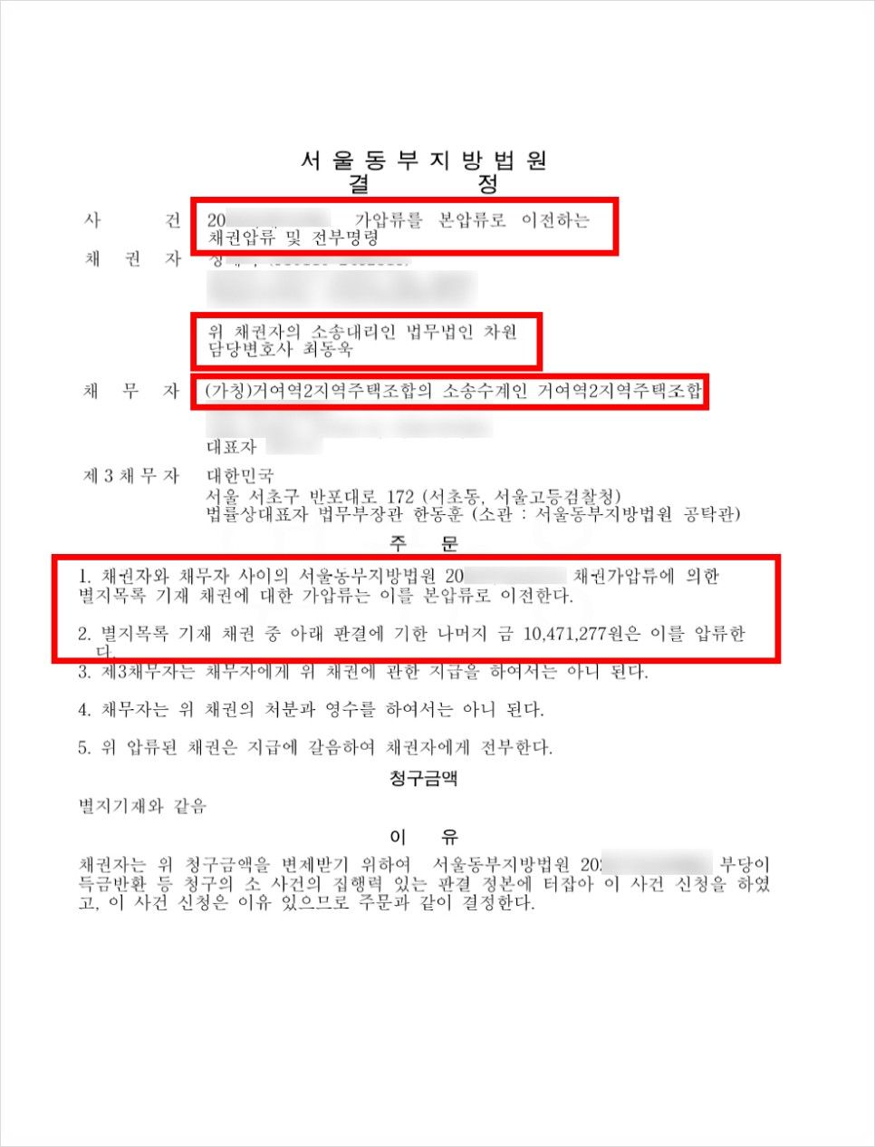 그런데 사업이 장기간 지연되어 불안감을 느낀 의뢰인들은 조합측에 탈퇴의사를 밝히며 분담금 반환을 요청하였지만 조합측에서 이를 거절하여 갈등이 더욱 심화되었고, 더 이상 시간을 늦출 수 없다고 판단한 의뢰인들은 최동욱 변호사를 통해 민사소송을 제기하게 되었고, 최동욱 변호사는 민사소송 제기와 동시에 거여역2 지역주택조합의 자금을 관리 중인 자산신탁사에 대하여도 채권가압류를 신청하였습니다.