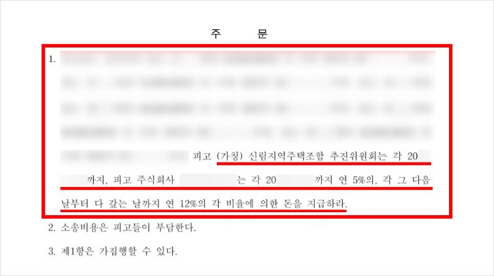 신림지역주택조합은 아파트 건립사업이 수년간 지체되고 예상치 못한 추가분담금이 발생하는 등의 문제점들로 인해 조합원들간의 갈등이 심화되었었습니다. 이에 따라 다수의 조합원들이 자신의 현 상태를 진단받고자 법무법인 차원의 최동욱 변호사와 상담을 진행하였고, 상담 후 조합측에서 본인을 기망한 사실을 알게되어 최동욱 변호사를 통해 민사소송을 진행하였습니다. 소송결과는 승소 하였고 실제 분담금을 회수해드렸었는데요. 이어 다시 신림지역주택조합의 다른 조합원들을 대리하여 소송을 진행하여 승소한 후 실제로 판결금을 회수하여 해당 내용을 공유해 드리고자 합니다.