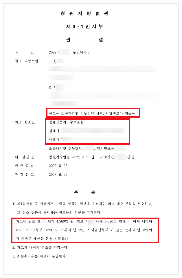 실제로, 최동욱 변호사에게 민사소송을 의뢰한 다른 의뢰인(김00) 또한 최근 아래와 같이 장유삼문 지역주택조합에 기지급한 금원 전액(조합원분담금 및업무대행비) 및 그에 대한 지연이자를 실제로 돌려받았습니다.