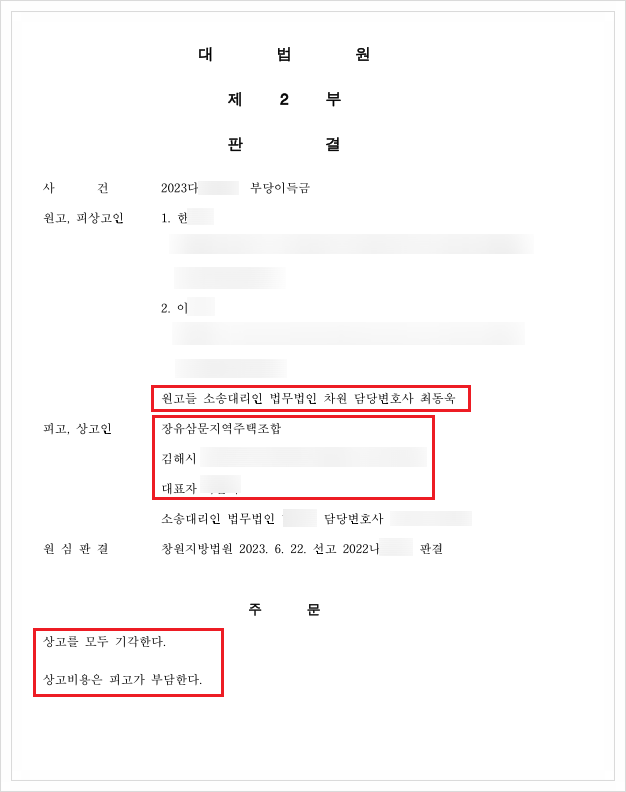 장유삼문 지역주택조합이 패소판결에 불복하여 대법원에 상고하였지만, 대법원은 아래와 같이 장유삼문 지역주택조합의 상고를 기각하였고, 이로써 의뢰인들의 전액 승소판결이 최종 확정되었습니다.