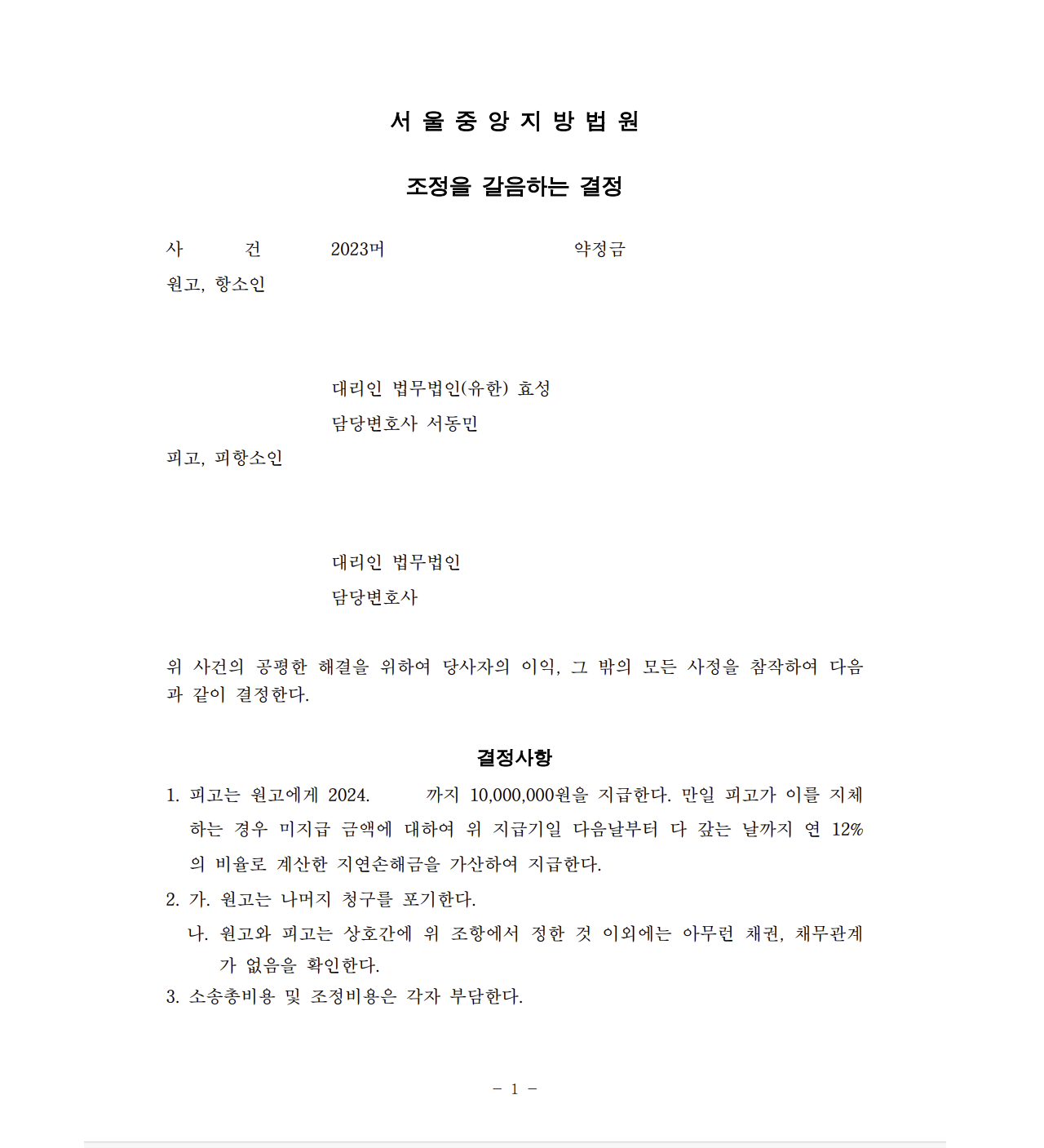 저는 즉각 약정금청구소송을 제기하였으며 법원은 피고가 의뢰인에게 남은 투자원금을 돌려주는 내용의 강제조정을 하여 의뢰인은 투자원금을 돌려받았습니다.