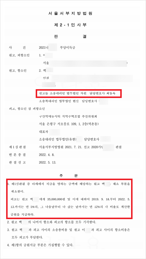 최동욱 변호사는 조합가입계약의 여러 가지 위법성을 주장하였고, 이에 서울서부지방법원은 아래와 같이 원고들에게 기지급금 전액 및 그에 대한 연 12% 지연이자의 반환을 명하는 승소판결을 선고하였습니다.