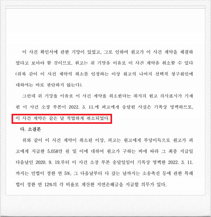 최동욱 변호사는 피고 조합의 토지확보율 설명 및 분담금 전액환불 약속의 무효성을 주장하였고, 그에 따라 법원은 아래와 같이 의뢰인(안oo)이 납입한 분담금전액의 반환 및 그에 대한 연 5%~ 12%의 이자의 반환을 명하는 전부 승소판결을 선고하였습니다.