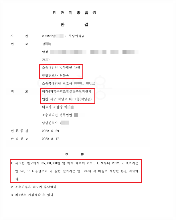 최동욱 변호사는 미래4 지역주택조합이 교부한 안심보장증서의 위법성 등을 주장하였고, 인천지방법원은 아래와 같이 의뢰인이 납입한 전액의 반환 및 그에 대한 연 12%의 지연이자의 반환을 명하는 전부 승소판결을 선고하였습니다.