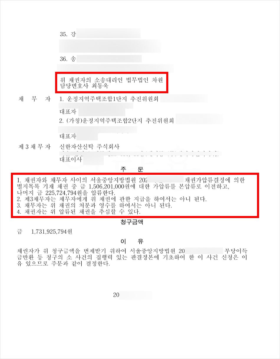 지역주택조합 소송에서 승소 여부만큼 중요한 것은 조합측의 재산을 압류하거나 추심하는 절차를 진행하는 것입니다. 최동욱 변호사는 조합측이 조합측의 재산을 부적절하게 운영하여 소진하여 버리거나 재판에서 패소함에도 불구하고 납부금반환 이행을 지연시키는 상황을 방지하기 위하여 강제집행을 통해 조합의 재산을 압류하거나 추심함으로써 조합측 재산에 대한 강제력을 확보하였고, 이에 따라 의뢰인들이 실제로 피해금원을 회수 하실 수 있도록 법적조력을 제공해 드리고 있습니다.