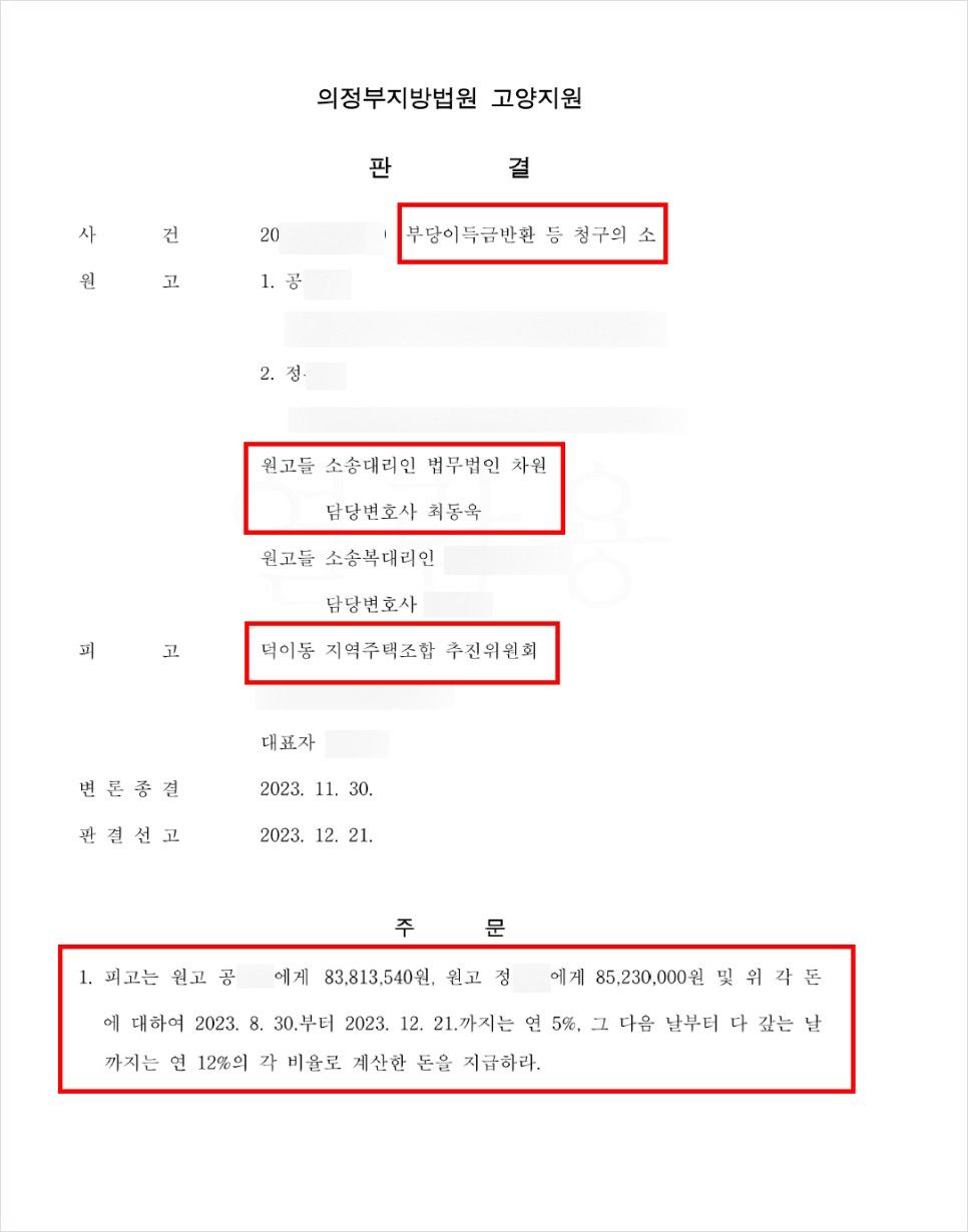 이에 따라 많은 덕이동 지역주택조합의 조합원 분들이 지주택 소송에 압도적인 성과를 보이고 있는 법무법인 차원의 최동욱 변호사를 통해 탈퇴 및 분담금 반환을 위한 소송을 진행한 후 승소하였습니다.