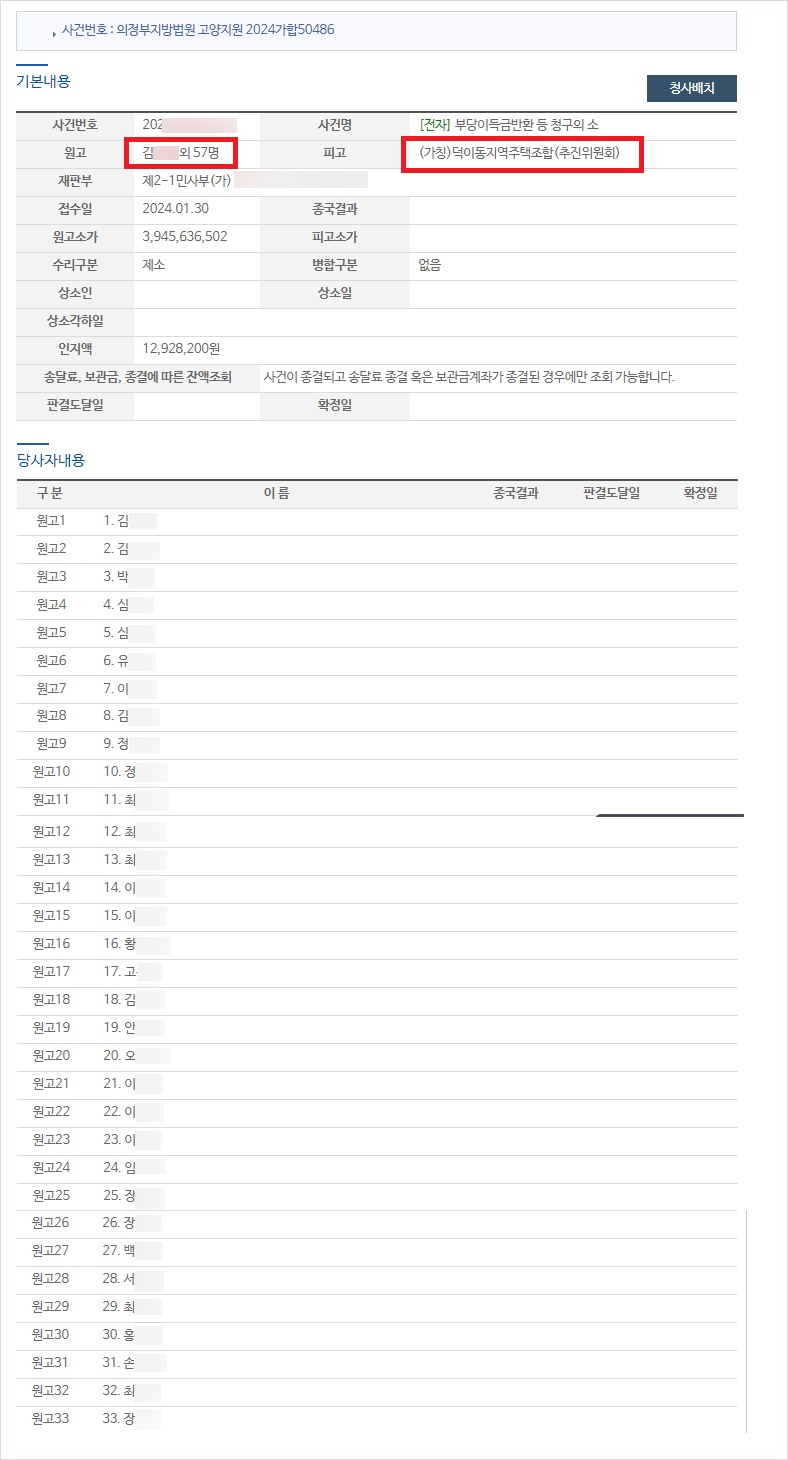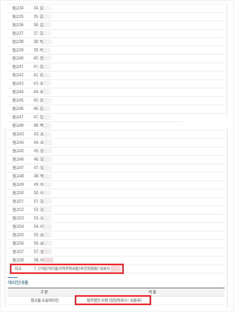 이러한 조합원분들의 탈퇴 흐름에 따라 최근에는 덕이동 지역주택조합의 조합원 58분(김OO님 외 57명)께서도 최동욱 변호사를 통해 단체소송을 제기하여 진행 중에 있습니다. 특히 최동욱 변호사는 이미 덕이동 지주택을 상대로 한 승소경험이 있는데다 단체소송은 대규모 피해자들에 대한 입장을 어필하는데 더 효과적이기 때문에 해당 소송에서도 승소를 할 수 있을 것이라 예상하고 있습니다.