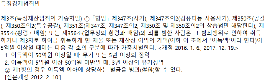 이 경우는 형법이 아닌, 다른 법이 적용이 되는데요. 바로 특정경제범죄 가중처벌 등에 관한 법률입니다. 위 특정경제범죄법이 적용이 되면, 형량이 훨씬 높아집니다.