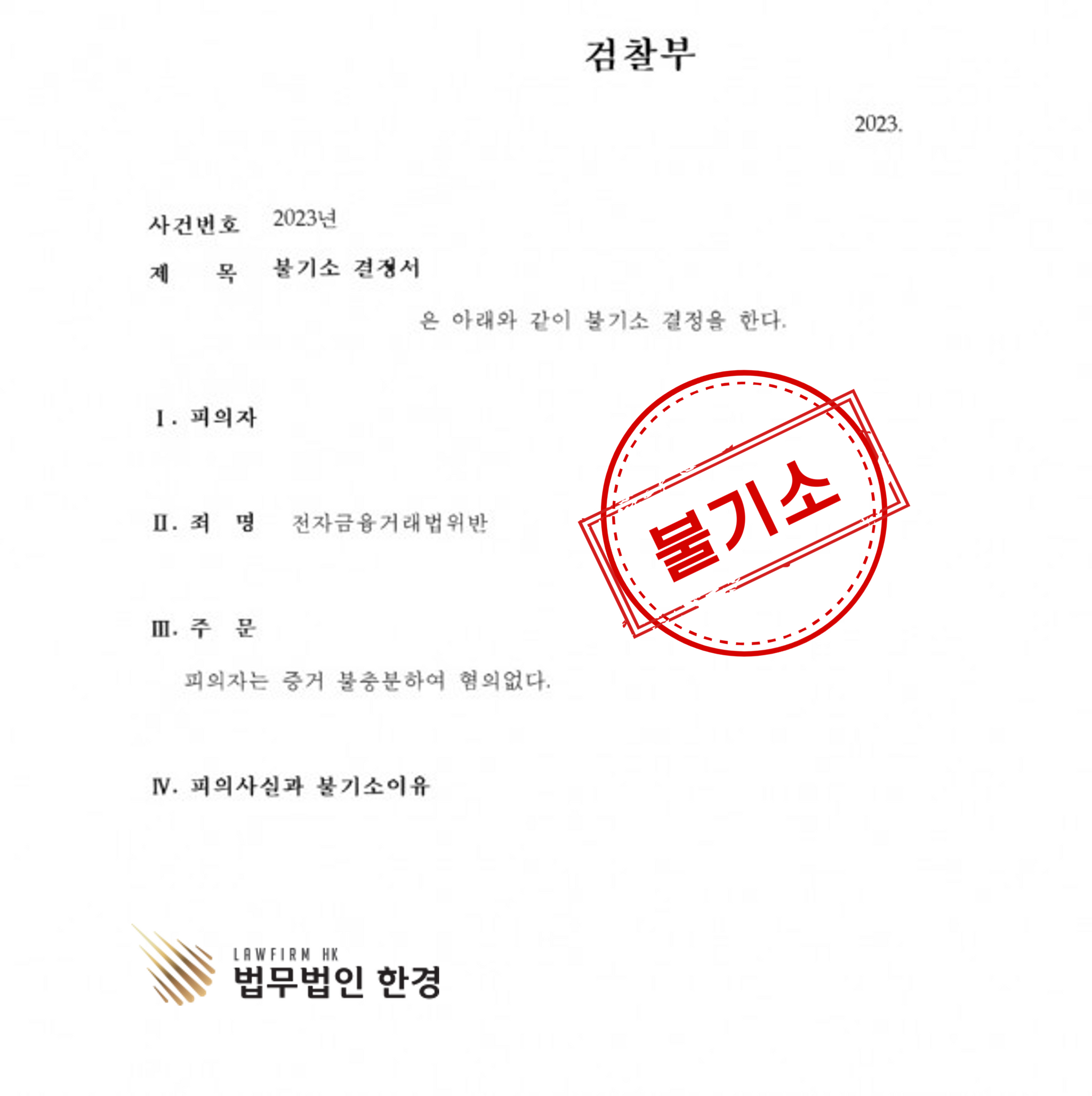 이 사건은 매우 까다로운 사건이였습니다. 사기방조, 전자금융거래법위반으로 송치가 되었음에도 결국 불기소 처분을 받아 냈다는 것에 대한 의의가 크다고 할 수 있습니다. 사건을 진행하다 보면 힘들고 어려운 구간의 시기가 오게 마련입니다. 법무법인 한경은 이런 구간에서도 포기하지 않고 최선을 다해 변호하겠습니다.