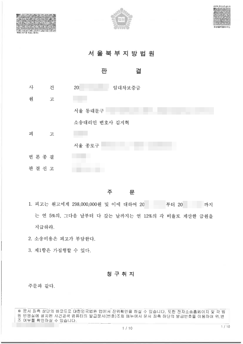 짧지않은 기간동안 믿고 따라와주신 덕분에 보증금 전액뿐만 아니라 강제집행 비용까지 전부 회수할 수 있었습니다.