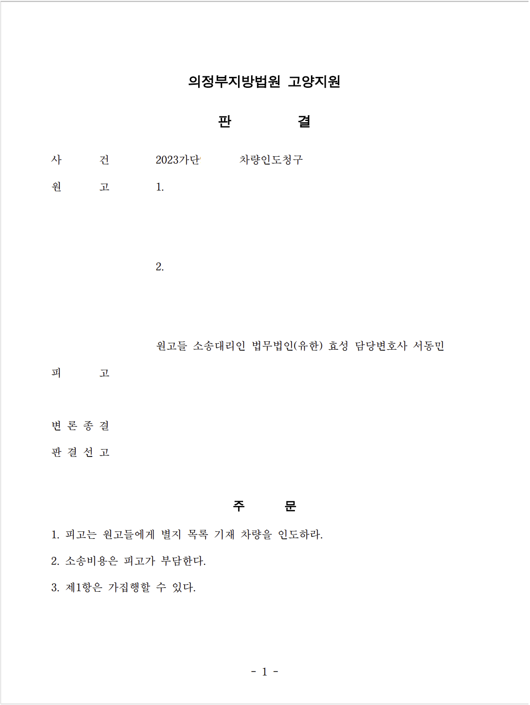 저는 즉각 자동차인도청구소송 및 자동차점유이전금지가처분을 하였고 가처분으로 자동차를 신속하게 회수한 후 본안 소송에서도 승소하여 의뢰인들은 자동차를 완전히 회수하였습니다.