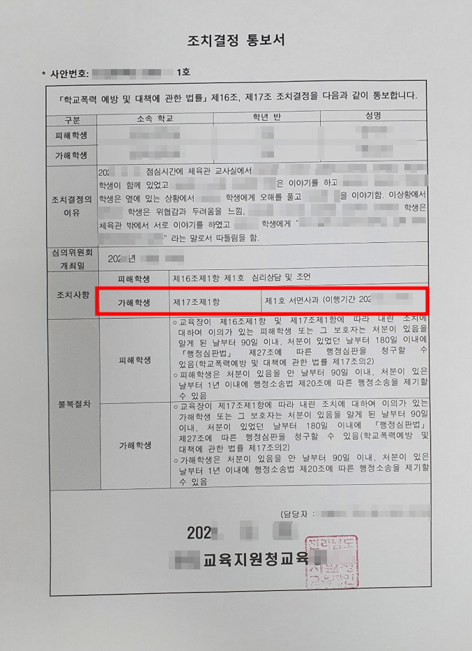학폭위 심의 결과 : 제1호 서면사과 처분(가장 경미한 처분)