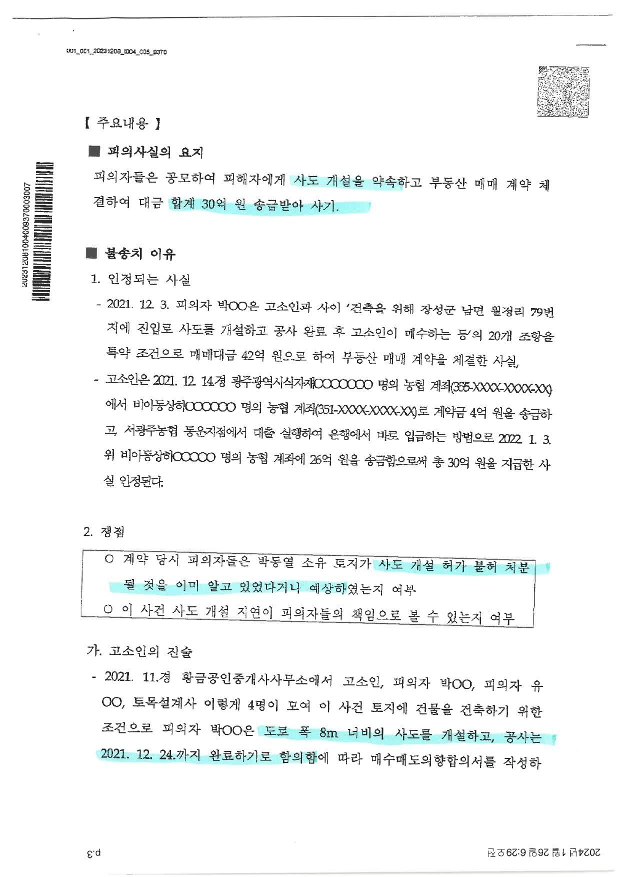 피해자는 토지를 30억원에 매도자로부터 구매하는 과정에서, 매도자와 공인중개사가 공모하여 마치 특정 조건의 사도 개설이 가능할 것처럼 피해자를 기망하였고, 특정 조건의 사도 개설이 불가능하다는 사실을 알았다면 해당 토지를 구매하지 않았을 것이라면서 매도자와 공인중개사를 사기죄로 형사고소 하였습니다.