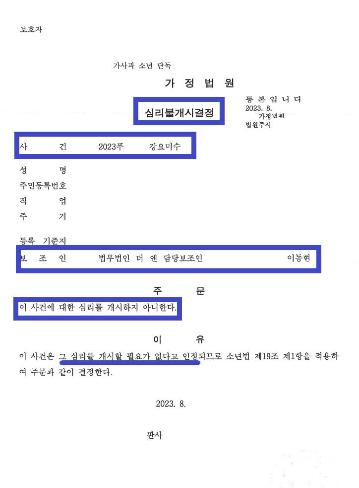 4. 심리불개시결정 (사이버 학교폭력(공문서위조, 위조공문서행사, 명예훼손, 강요미수 등)으로 신고당했으나 가정법원의 '심리불개시결정'을 받은 사건)