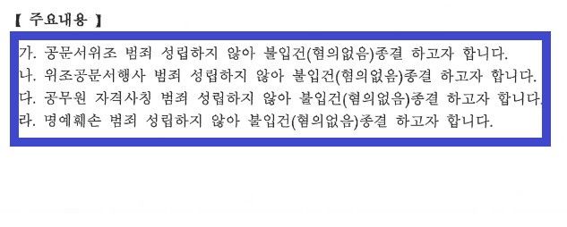 ① 공문서위조, 위조공문서행사죄 에 대해서는, '이미지'는 문서에 해당하지 않아 공문서 위조죄가 성립하지 않는다는 점, A군이 만든 수사결과지는 실제 공공기관에서 사용하는 문서 양식이 전혀 아니기 때문에 사용권한자와 용도가 특정된 진정하게 성립된 공문서에 해당하지 않는다는 점 등을,