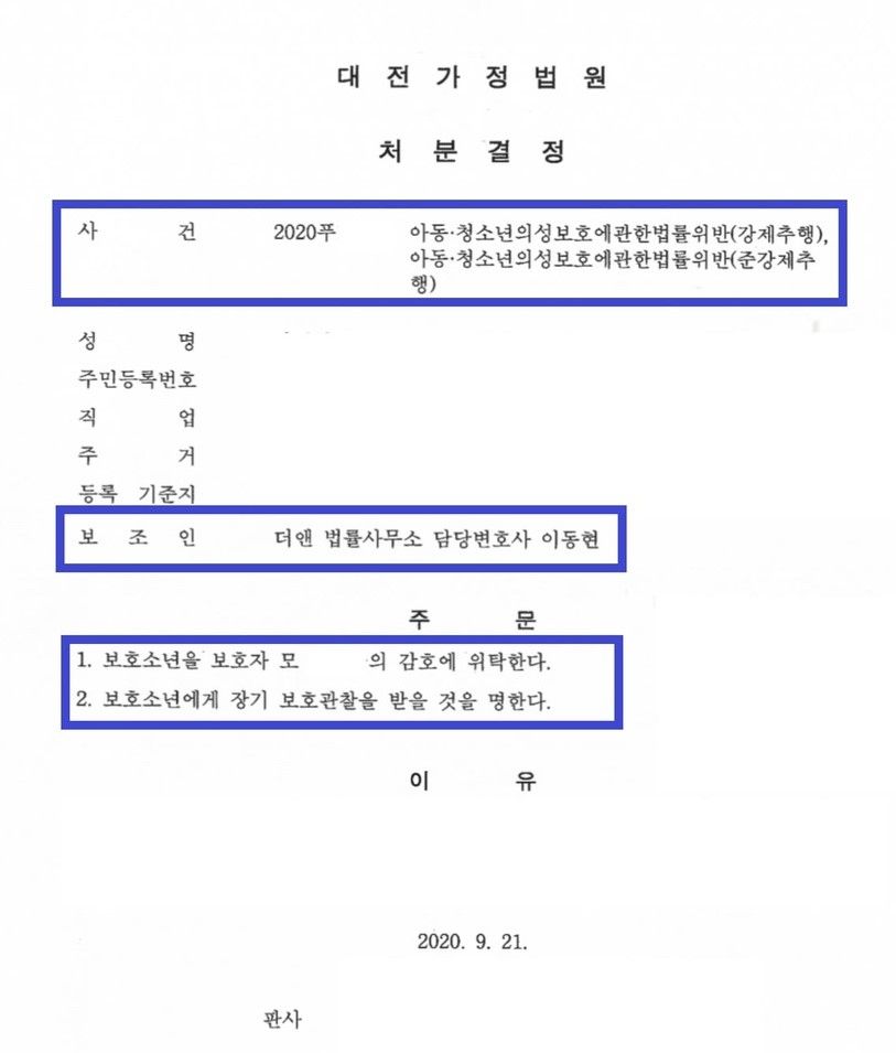 위와 같은 조력을 바탕으로, 결국 A군은 가정법원으로부터 '1(보호자 감호위탁), 5호(장기보호관찰)' 처분을 받았습니다.
