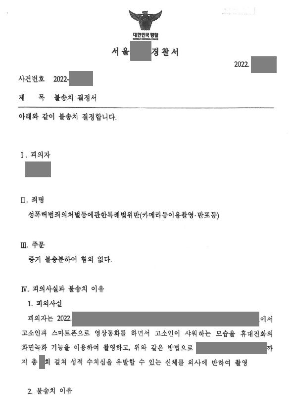 수사기관도 역시 저의 법리 주장을 받아들이며 고소인이 스스로 자신의 신체와 샤워하는 모습을 핸드폰 카메라에 비춘 것으로, 그 영상은 고소인이 자신의 의사에 따라 직접 자신의 신체를 촬영한 것이지 피의자가 직접 촬영한 것이라고 인정하기 어렵다며 불송치 결정을 내렸습니다. 이로써 의뢰인은 수사단계에서 무혐의로 사건을 마무리할 수 있었습니다.