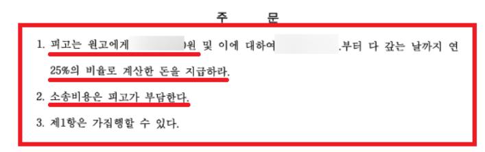 그 결과, 대여금에 대하여 연 이자 25%의 비율로 계산한 돈을 지급하라는 판결을 받게 되었습니다.