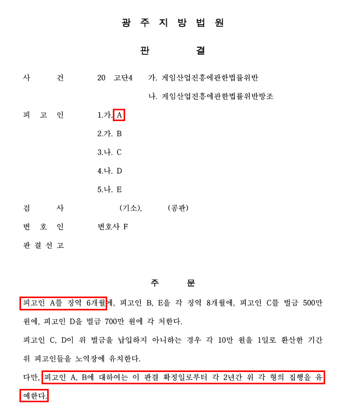 - 피고인들은 광주 모 지역 2층에 있는 게임장에서 뉴팬텀스페셜카드 게임기 70대를 설치하여 운영하면서, 피고인 A는 게임장의 전체적 운영과 관리를, 피고인 B는 야간 환전 역할을, C는 바지사장 역할, D는 주간 업소 관리와 IC카드 판매 역할을, E는 야간 업소 관리와 IC카드 판매 역할을 하였습니다.