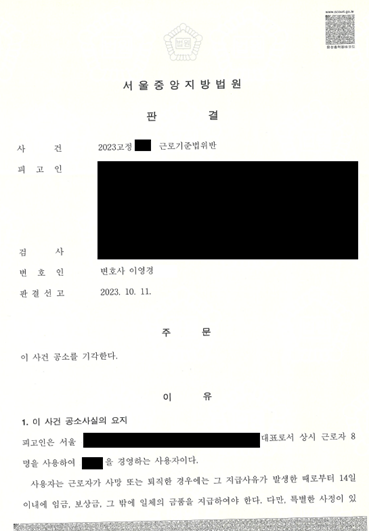 오늘은 병원을 운영하며 직원을 고용했던 사용자인 피고인이 직원의 임금과 퇴직금을 지급하지 못하여 근로기준법위반으로 기소된 사건에서 피고인을 조력하여 공소기각판결을 선고받은 사건을 설명드리도록 하겠습니다.