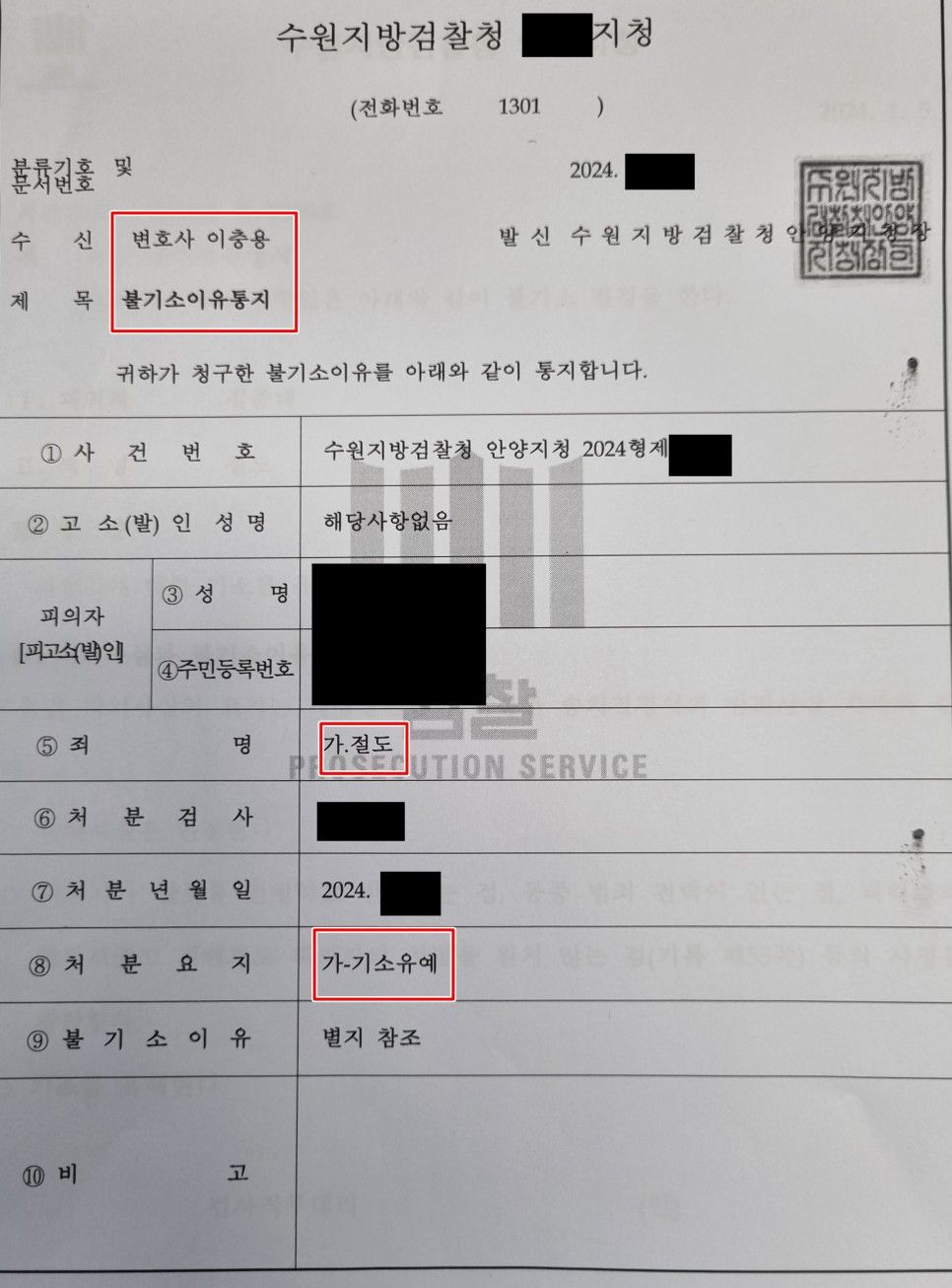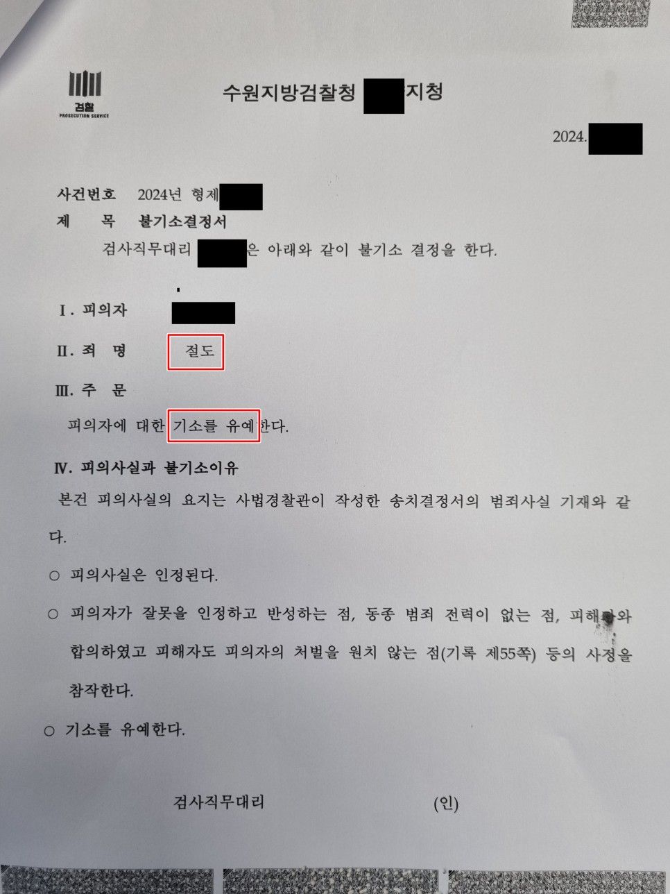 담당 검사님께서는 제 의견을 모두 받아들이시고 의뢰인에게 기소유예 처분의 선처를 내리셨습니다.